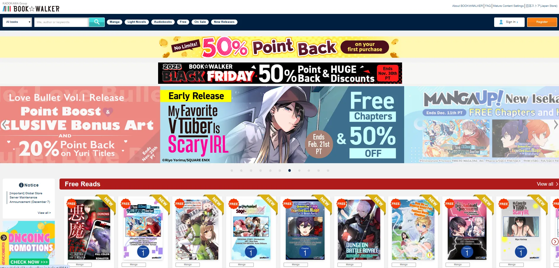 Book Walker 采取电子书商城模式,而非单纯的连载平台。它是获取难以找到的数字收藏的绝佳选择,拥有独家 KADOKAWA 等出版社的作品。该平台是数字漫画爱好者的收藏宝库。