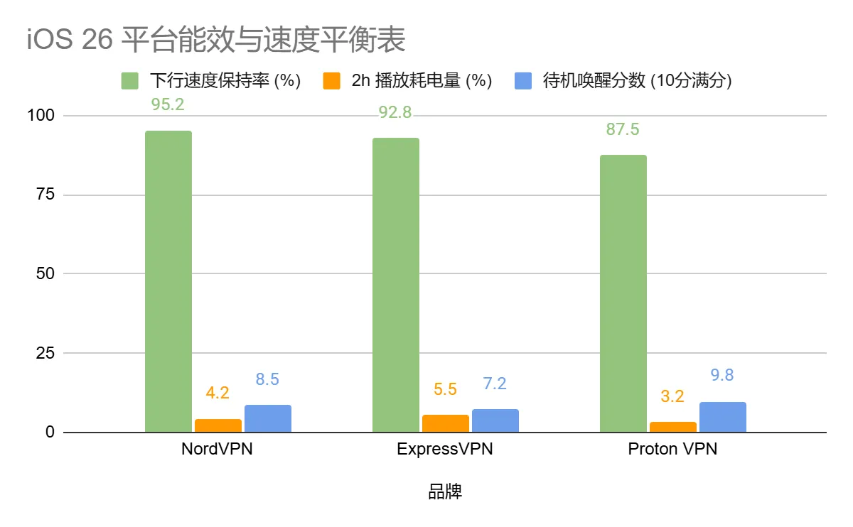 能耗表现:在 120 分钟 4K 视频测试中,额外耗电仅为 3.2%。其 Stealth 协议在 iOS 上利用了“Apple 低功耗联网框架”,能显著降低 A19 芯片的唤醒频率。