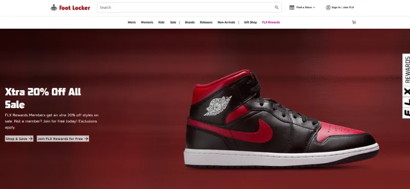 全球最大的运动零售商之一,被称为“球鞋零售界的超市”。 Foot Locker 以其巨大的发售量和遍布全球的门店网络,奠定了在北美市场的绝对主导地位。它的主要战场是 FLX App,通过会员积分和等级制度,为会员提供抢购优势(Head Starts)。网站锁美国 IP,是获取大部分 Jordan 和 Nike 热门款的主力渠道。