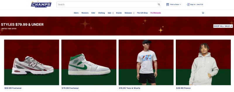 Foot Locker 集团旗下,风格更倾向于潮流运动和休闲街头服饰,面向年轻消费群体。Champs Sports 的网站设计更具活力和视觉冲击力,是集团内部针对年轻市场的分支。它常与 Foot Locker 共享热门款发售,但其库存分配可能略有不同,为多平台抢购提供了额外的机会。