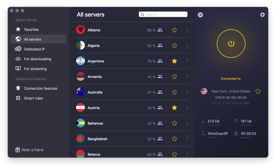 功能最全。都有“智能规则”。Windows 用户还能用“拆分隧道”(你可以指定哪些 App 走 VPN,哪些走常规网络,超实用!)。Mac 用户能看到服务器负载,帮你选更快连接。 |