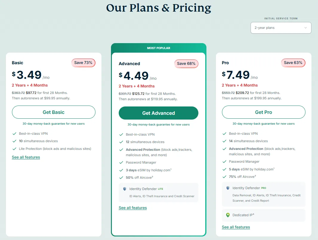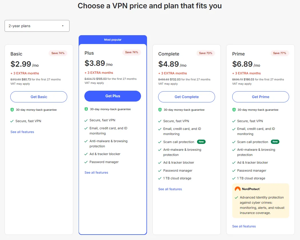 NordVPN 的优势:它用更低的起步价抢占市场,但你需要注意它的分级套餐。如果你想要威胁防护 Pro(恶意文件扫描)、密码管理器(NordPass)等重要的附加功能,你就需要升级到 Plus 或 Complete 等级,此时价格会比 ExpressVPN 的基础长期套餐高出一些。