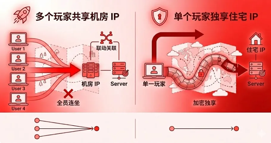 加速器节点通常部署在云服务器或机房中。对于游戏服务器而言,这些 IP 带有明显的“非居民”标签。 -