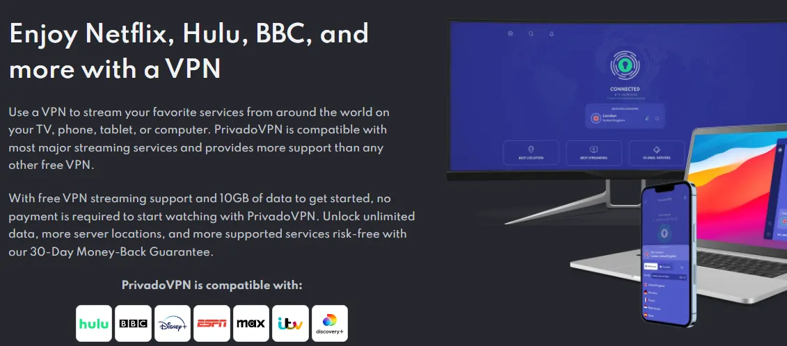 免费版支持流媒体:这是其最大的杀手锏——PrivadoVPN 是极少数允许免费用户解锁流媒体(包括 BBC iPlayer 和 Netflix)的 VPN 之一。