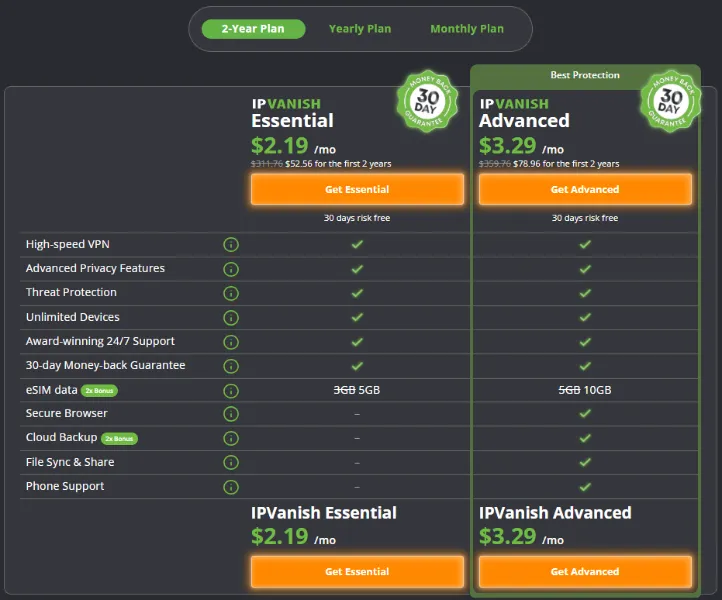 IPVanish 提供三种订阅方案:单月套餐、年付套餐和 2 年长期套餐。