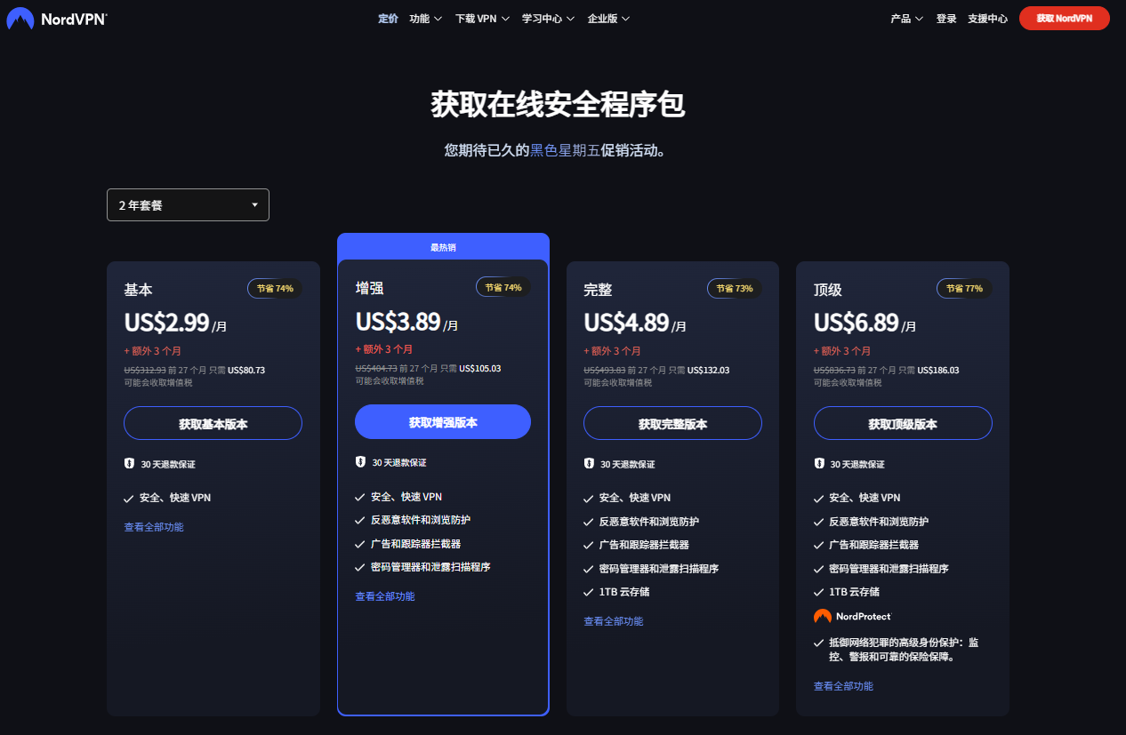 NordVPN 通常提供“基础版”、“增强版”和“完整版”等选项。如果你只是需要 VPN 功能(加密、隐藏 IP、绕过地理限制),基础版通常就足够了。但如果你看中密码管理器、数据泄露扫描或额外云存储,可以选择更高级的套餐。