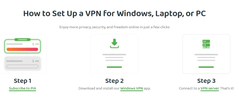 启动和使用 Private Internet Access (PIA) 简单快捷,只需以下三个步骤,即可立即获取网络安全和自由访问权限: