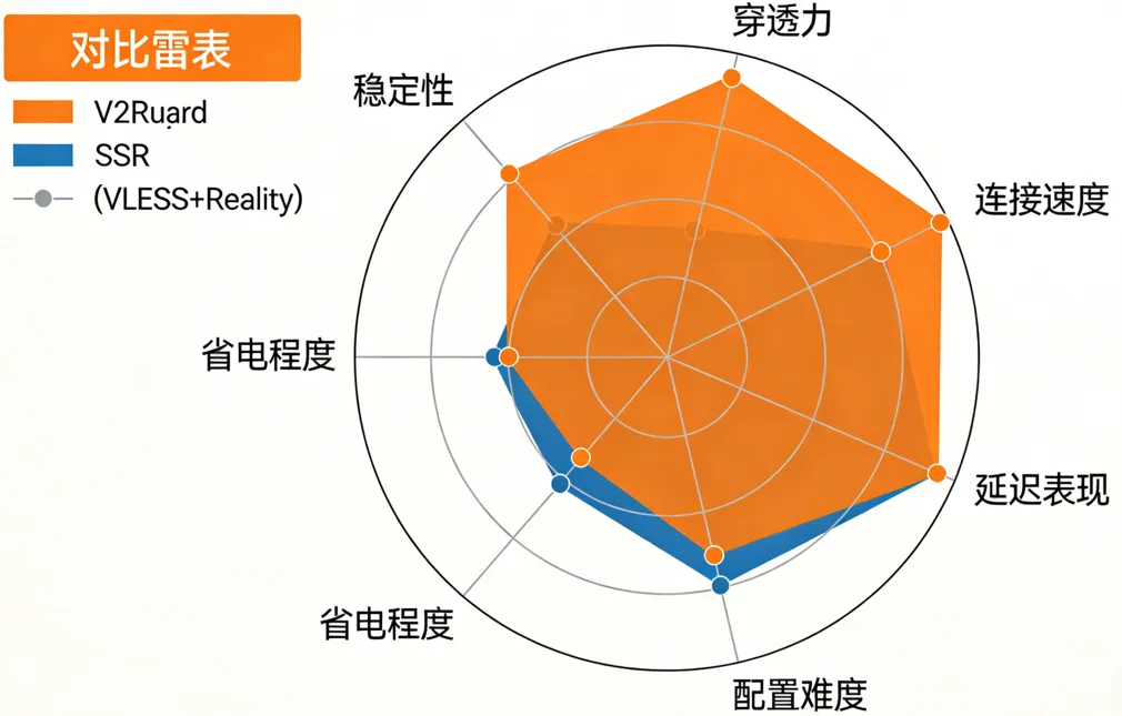 本文核心价值在于填补这一信息空白:通过标准化测试环境,对三大协议进行全方位横向对比,重点聚焦 2026 年最新网络环境下的速度表现与 GFW 穿透力实测,同时覆盖功耗、设备兼容性、配置难度等关键维度,最终输出清晰的实战选型指南,帮助不同需求的用户快速找到最优解。