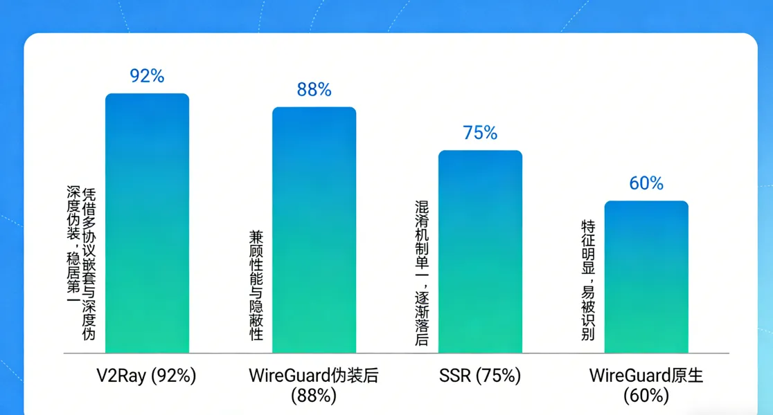WireGuard 伪装后 (88%) —— 兼顾性能与隐蔽性。