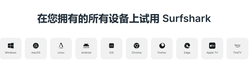 Fire TV / Fire Stick 和 Apple TV: 提供原生应用程序。用户可以直接在亚马逊应用商店下载 Fire TV 和 Fire Stick 应用。Surfshark 也是极少数为 Apple TV 提供原生应用程序的 VPN 之一。