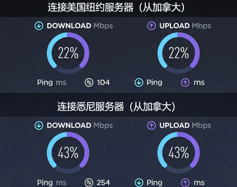 远距离服务器速度:即使是连接远距离服务器,速度下降幅度也远低于行业平均水平。连接美国纽约服务器时,下载速度下降约 22% ;连接 17000 公里以外的悉尼服务器,下载速度平均降幅也仅有 43% 。