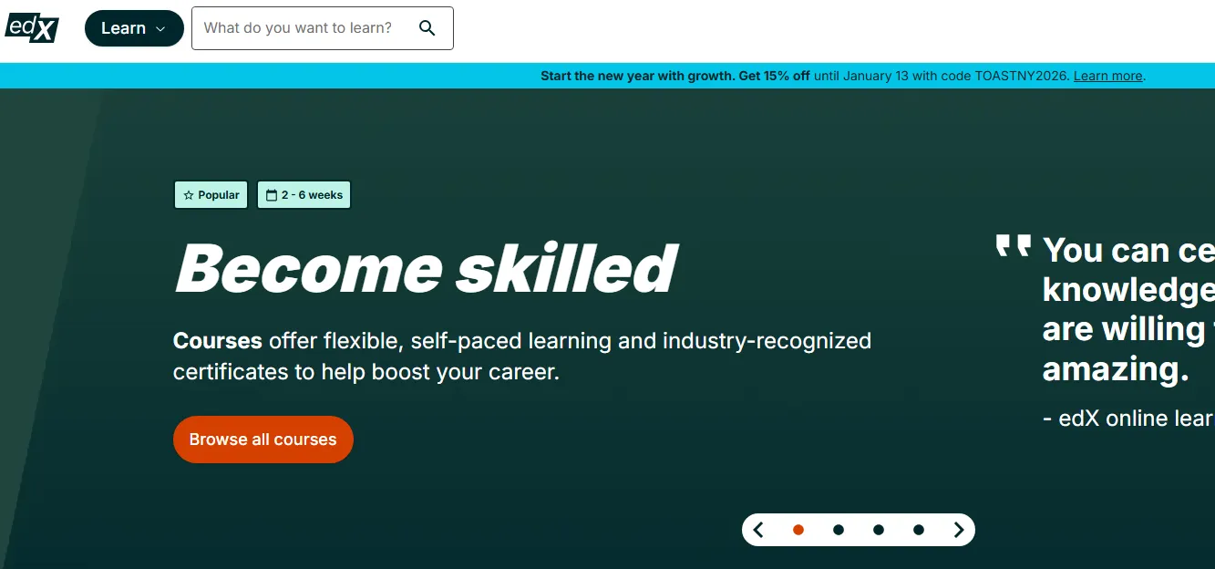 edX:由麻省理工学院和哈佛大学联合创建的非营利性平台,提供免费旁听课程与付费认证服务。优势在于理工科课程资源丰富,尤其是人工智能、工程学等领域的课程,由顶尖教授授课,配套完整的实验指导与学习社群,适合科研入门与深度学习。