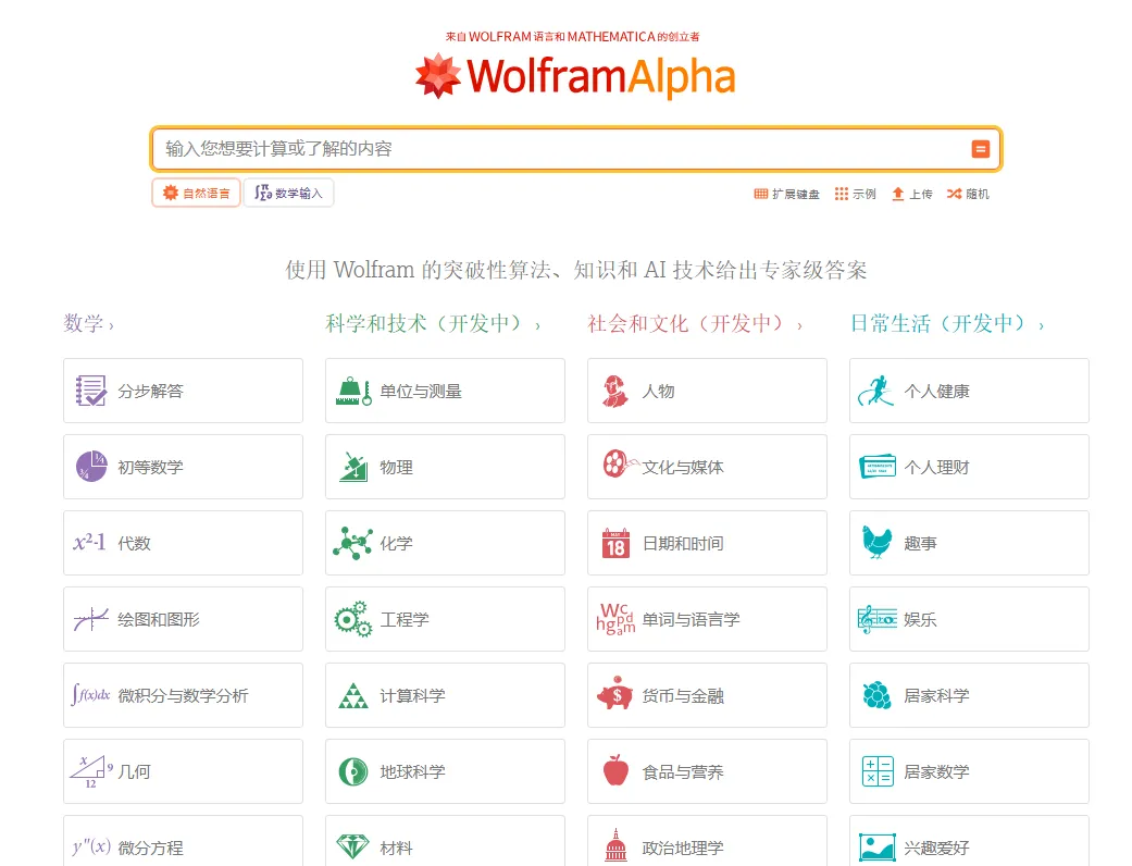 Wolfram Alpha:智能学术搜索引擎,区别于传统搜索引擎的“返回链接”模式,可直接生成问题答案与分析报告。例如输入数学公式可直接获得推导过程,查询科研数据可生成可视化图表,适合快速解决学术疑难问题。
