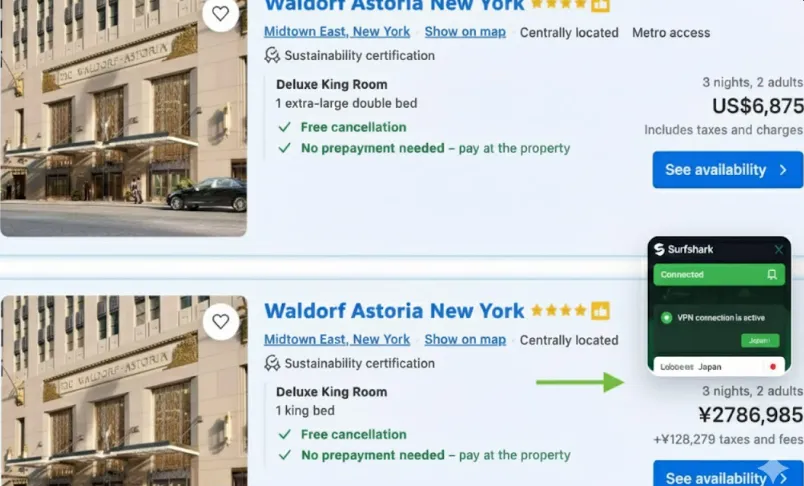 请注意: 这些网站往往带有不确定性。“晚鸟”优惠仅适合临时或灵活的旅行计划;而竞拍网站有时价格可能比原价更高,需要凭运气。因此,最稳妥的方法是:结合使用 VPN 来突破地域价格限制,并在常规价格比较网站(如 Booking.com、Expedia)上寻找超值价格。
