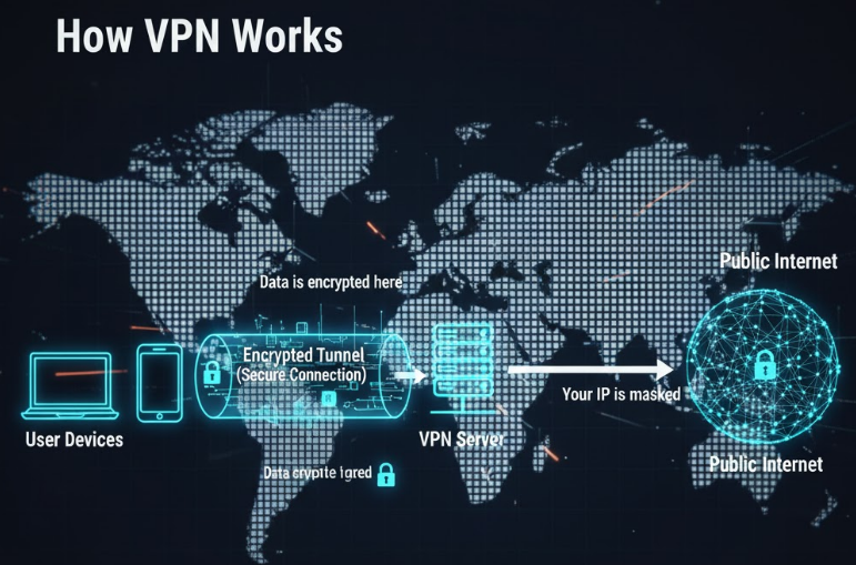 简单来说,VPN 帮你做了两件最重要的事:隐藏你的真实身份(IP) 和 保护你的数据不被偷看(加密)。