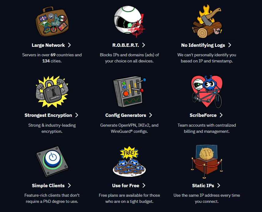 免费版的主要限制是每月 10GB 的流量限额和较少的服务器位置选择。付费版则提供无限流量、更多服务器,以及更强大的 R.O.B.E.R.T. 功能。 -