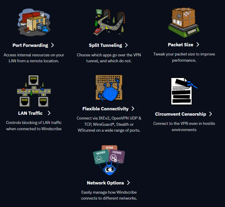 Wstunnel(专有协议):这是 Windscribe 针对高度受限网络环境设计的协议,它将 VPN 流量伪装成常规网页流量,能有效绕过严格的审查和深度数据包检测 (DPI)。