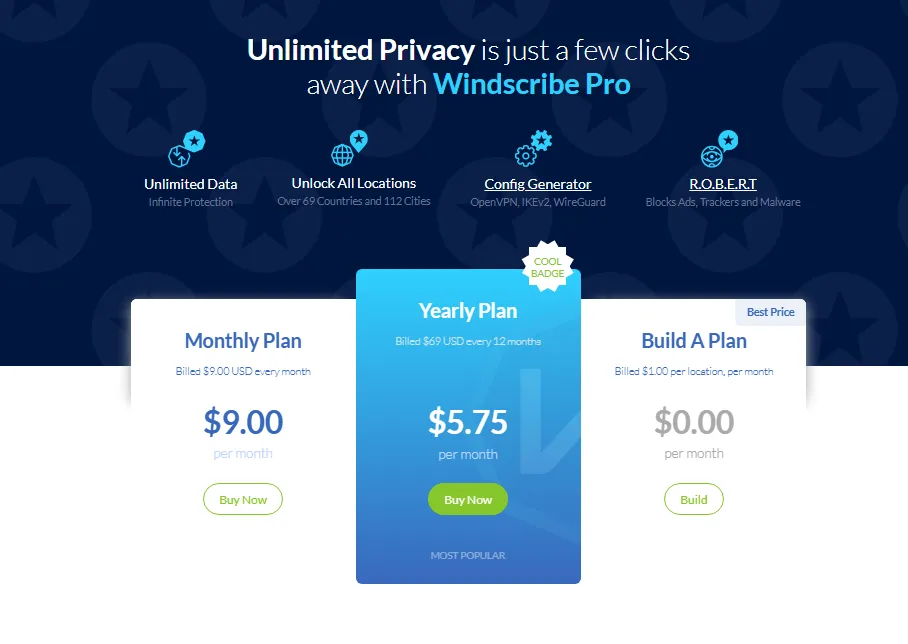 Windscribe 最独特的卖点莫过于其 "Build-A-Plan" (自选订制) 方案。如果你不需要全球 60 多个国家的服务器,只想解锁特定的流媒体区域,这个方案能让你以极低的价格享受 Pro 版的所有高级功能。